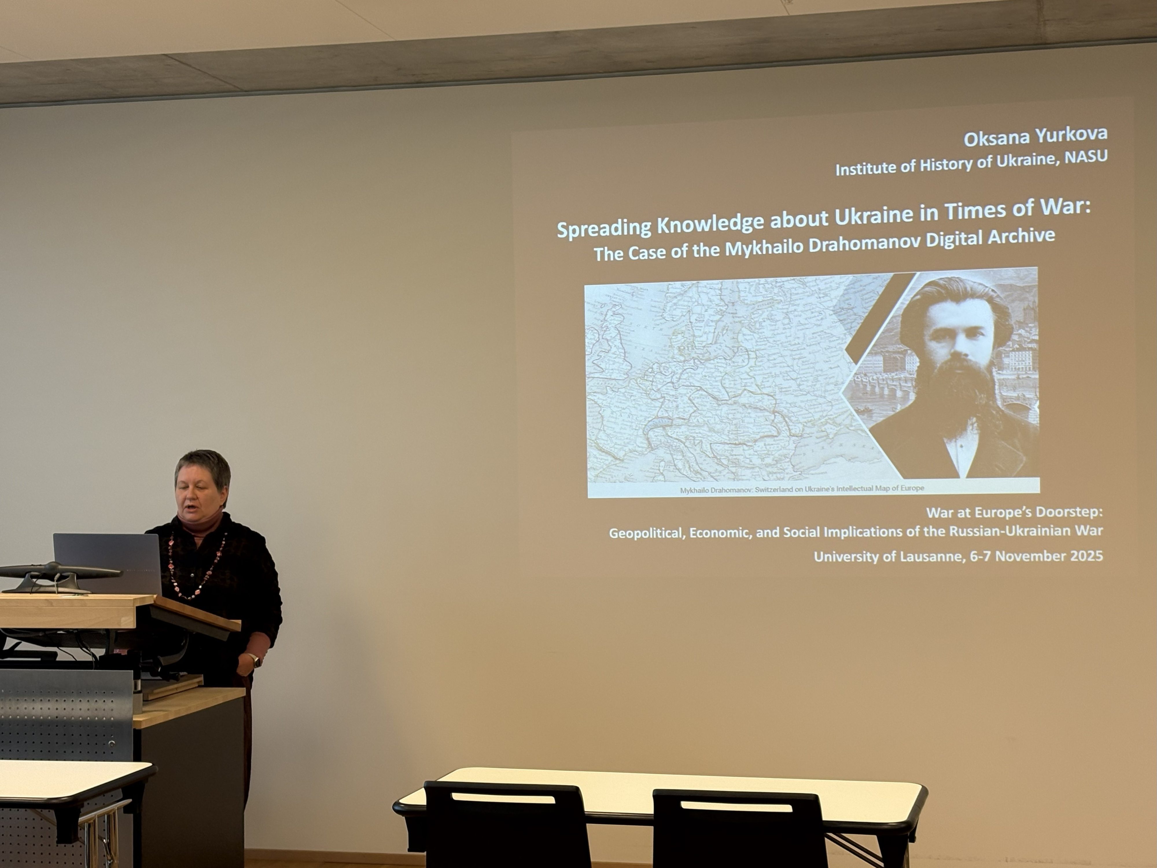 On November 6, 2025, project members Oksana Yurkova and Svitlana Blashchuk presented the concept of the Mykhailo Drahomanov Digital Archive during an international academic event in Lausanne.