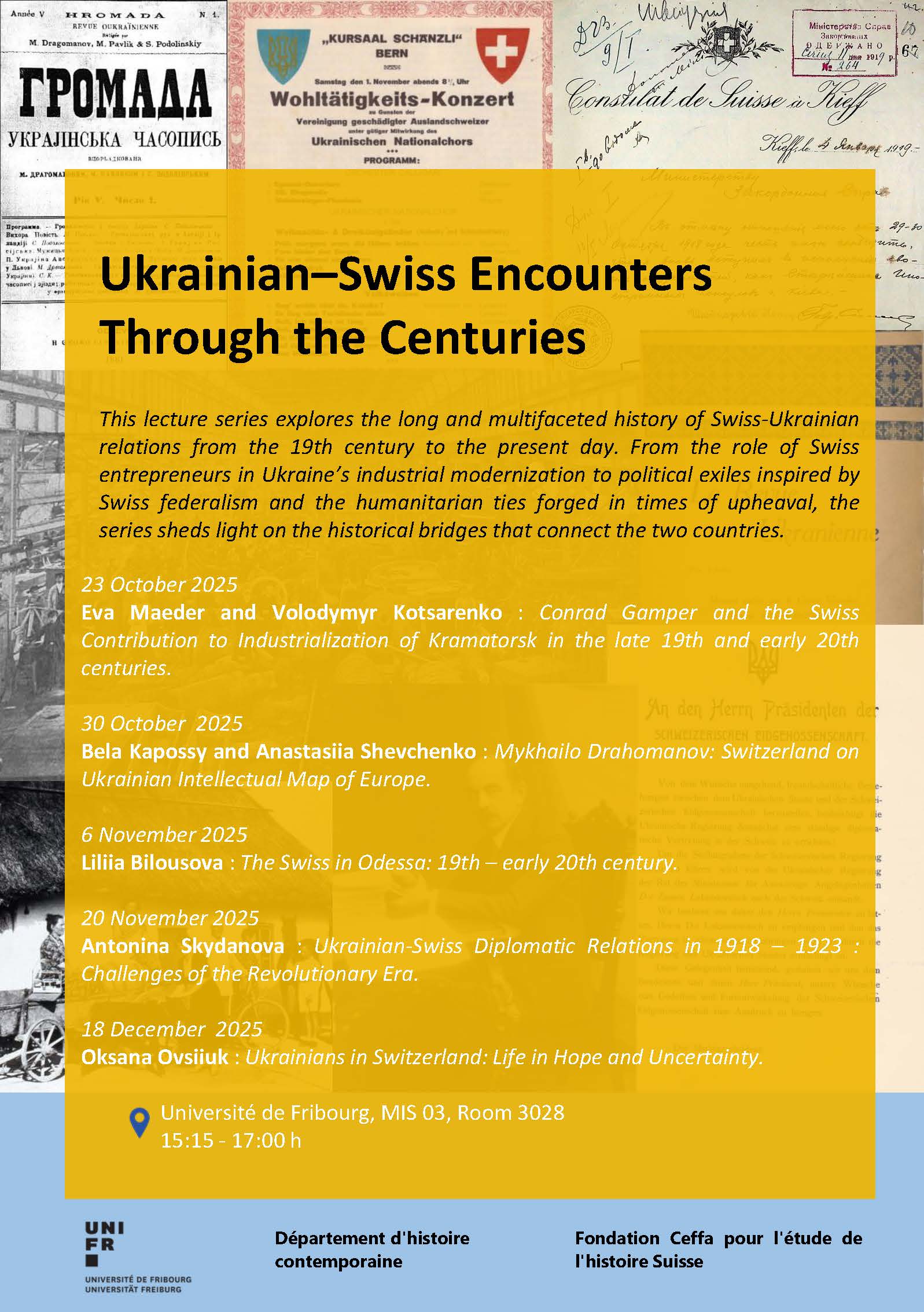 On October 30, 2025, project participants Professor Béla Kapossy and Dr. Anastasiia Shevchenko (University of Lausanne) delivered a lecture at the University of Fribourg, within the open lecture series on Ukrainian-Swiss historical relations in the 19th and early 20th centuries.